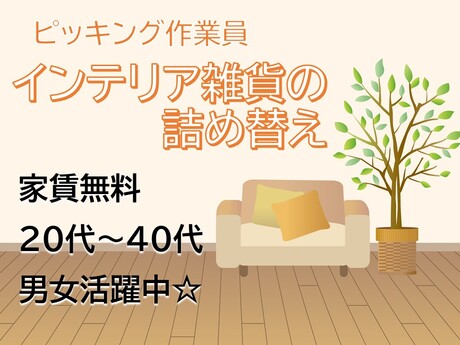 ピッキング作業員/インテリア雑貨の詰め替え/倉庫内勤務/寮費ゼロ円/即日就業可能/20代~40代男女活躍中
